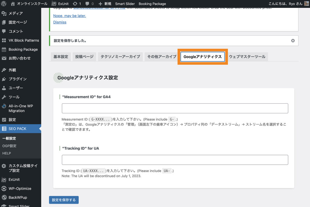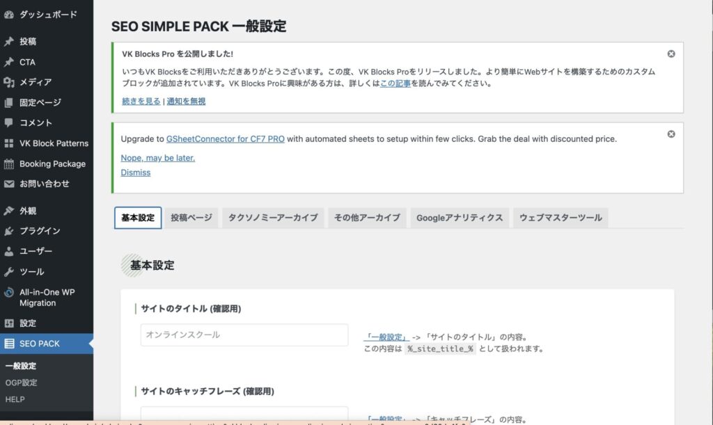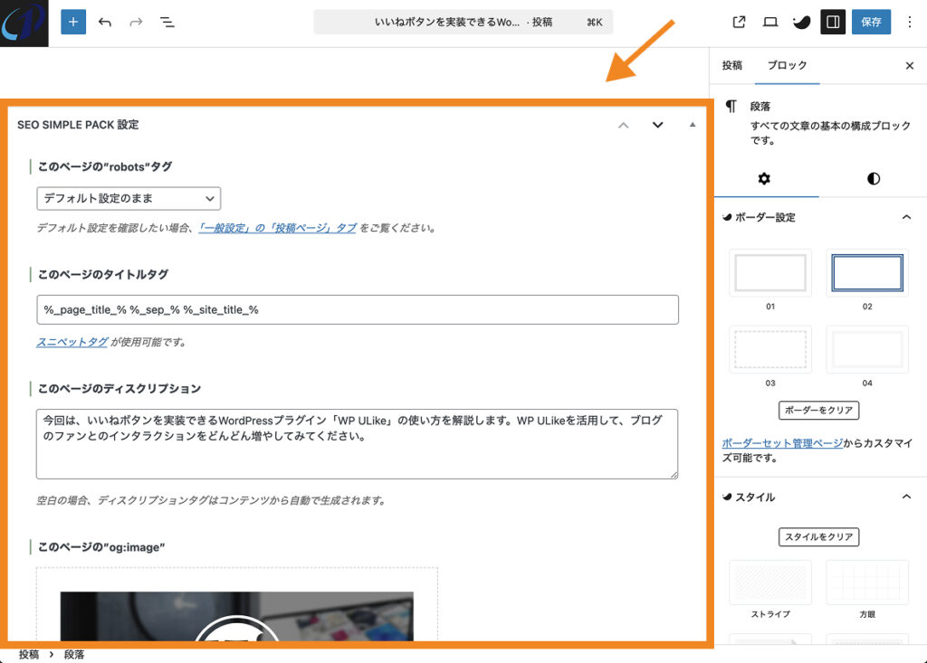 SEO SIMPLE PACKを導入すると、投稿、固定ページ毎にmeta descriptionタグを設定したり、Googleアナリティクスと連携させたりといった必要最低限の設定ができるようになります。