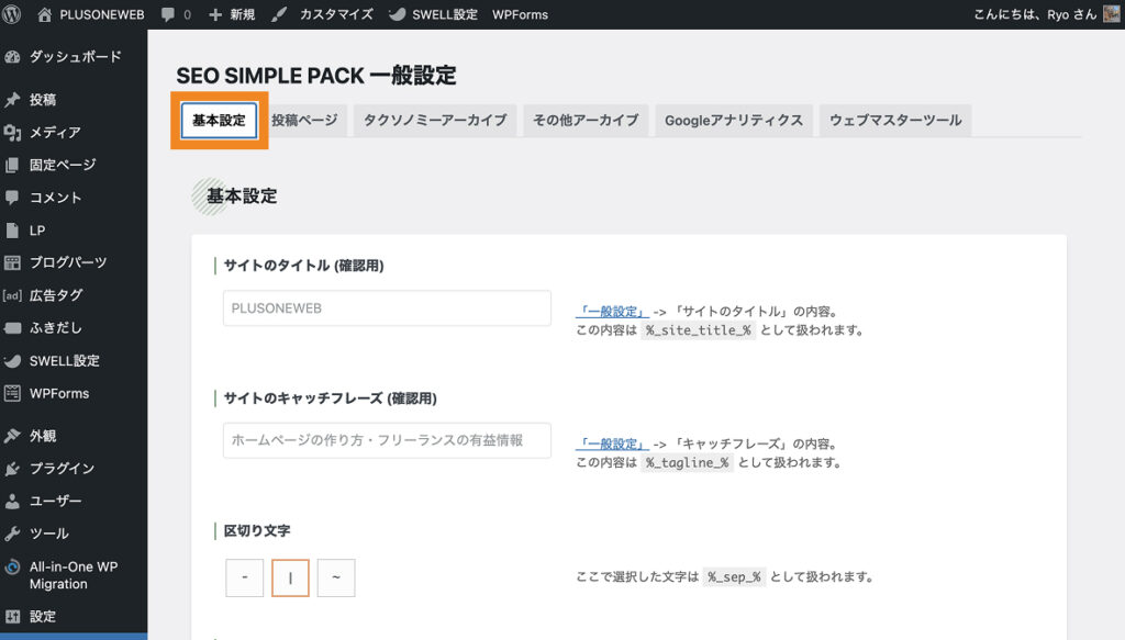 「SEO PACK>一般設定」の「基本設定」タブでは、主にフロントページに関する設定や区切り文字の設定、検索結果ページや404ページといった特殊ページのタイトルタグの設定ができます。