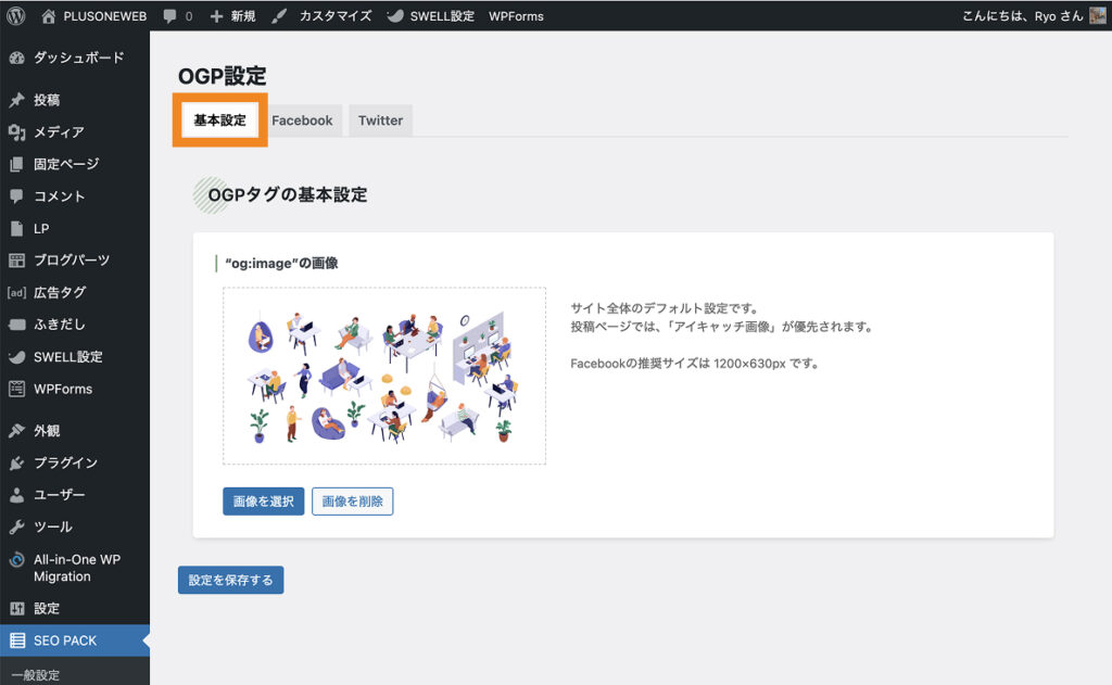 「基本設定」タブでは、SNSでシェアされた際に表示させる画像(og:image)を設定できます。