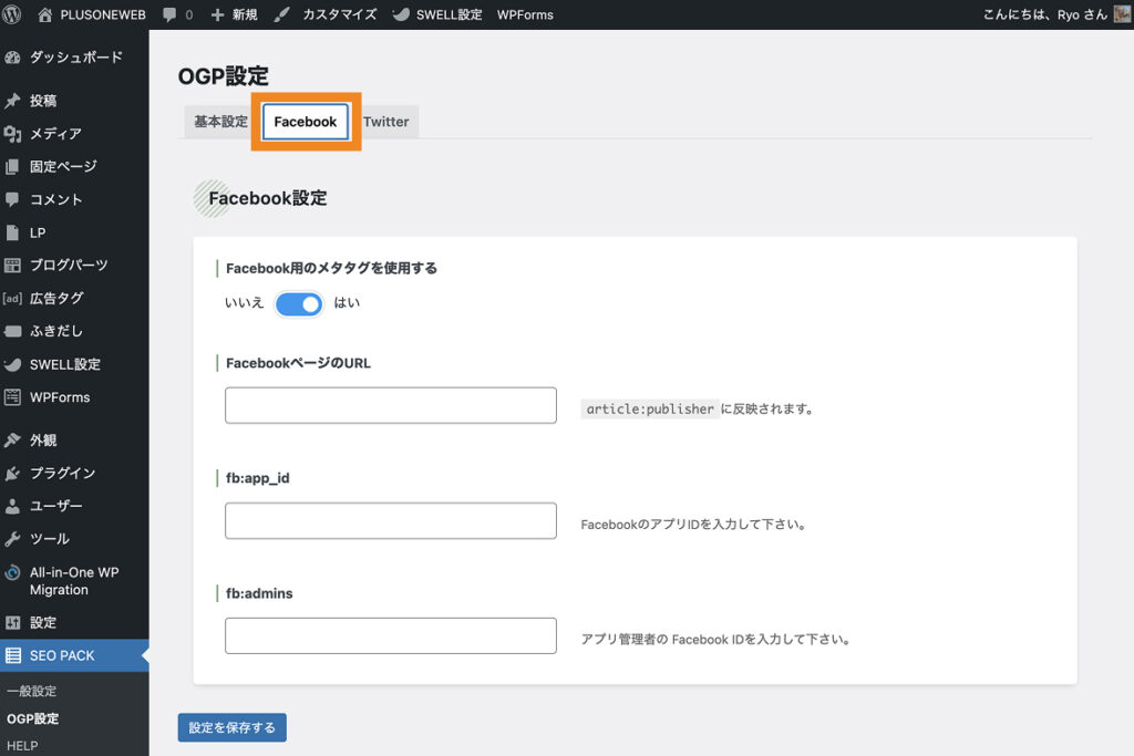 WEBサイトのFacebookページがあれば「Facebook用のメタタグを使用する」を「はい」にしておきましょう。