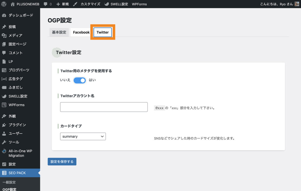 「Twitter」タブでは、X(旧:Twitter)用のメタタグ設定ができます。