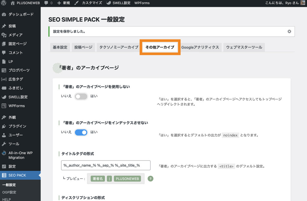 「その他アーカイブ」タブでは、カテゴリーやタグページのタイトル形式、ディスクリプション形式の設定ができます。