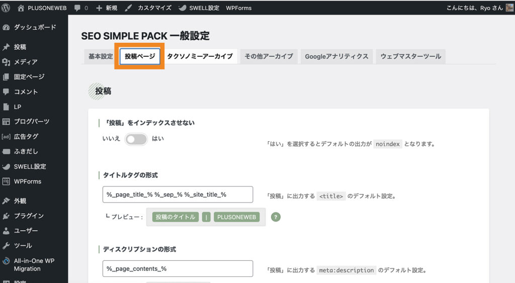 - 投稿ページのインデックス設定、タイトル・ディスクリプション形式の設定