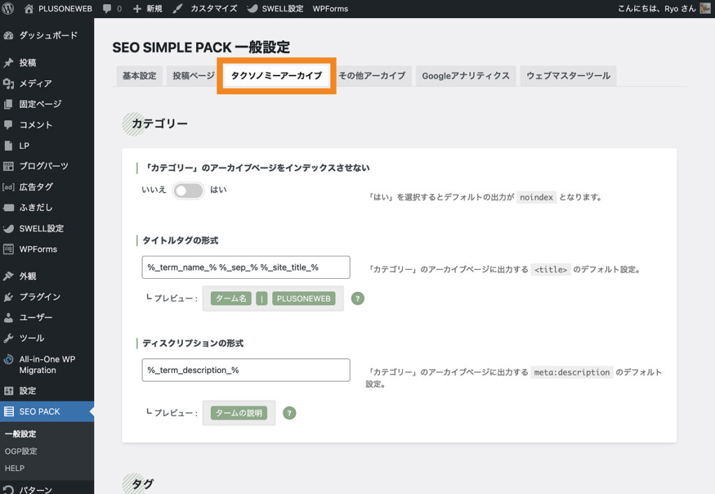 「タクソノミーアーカイブ」タブでは、カテゴリーやタグページのタイトル形式、ディスクリプション形式の設定ができます。
