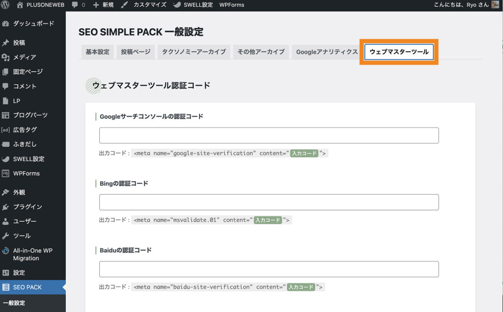 「ウェブマスターツール」タブでは、各種ウェブマスターツールとの連携設定ができます。