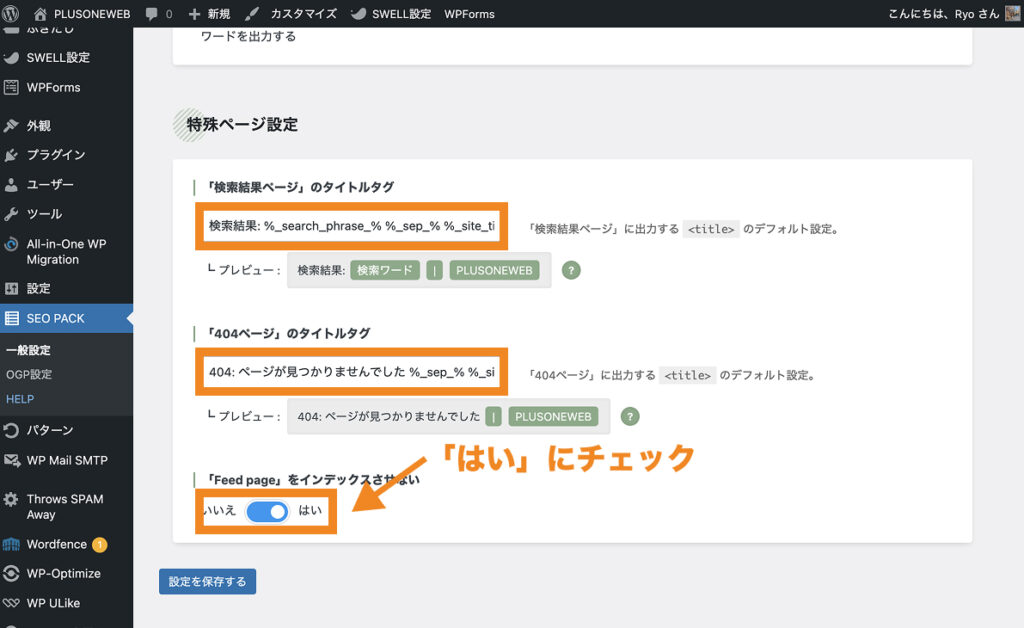 検索結果ページや404ページのタイトルタグやFeedページのインデックス設定は、以下の部分で行います。