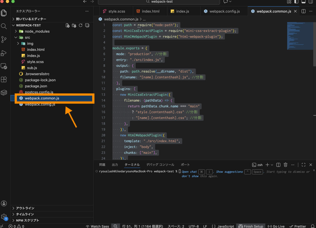 };続いて、webpack.config.jsを複製し、複製したファイル名を「webpack.common.js」に変更します。