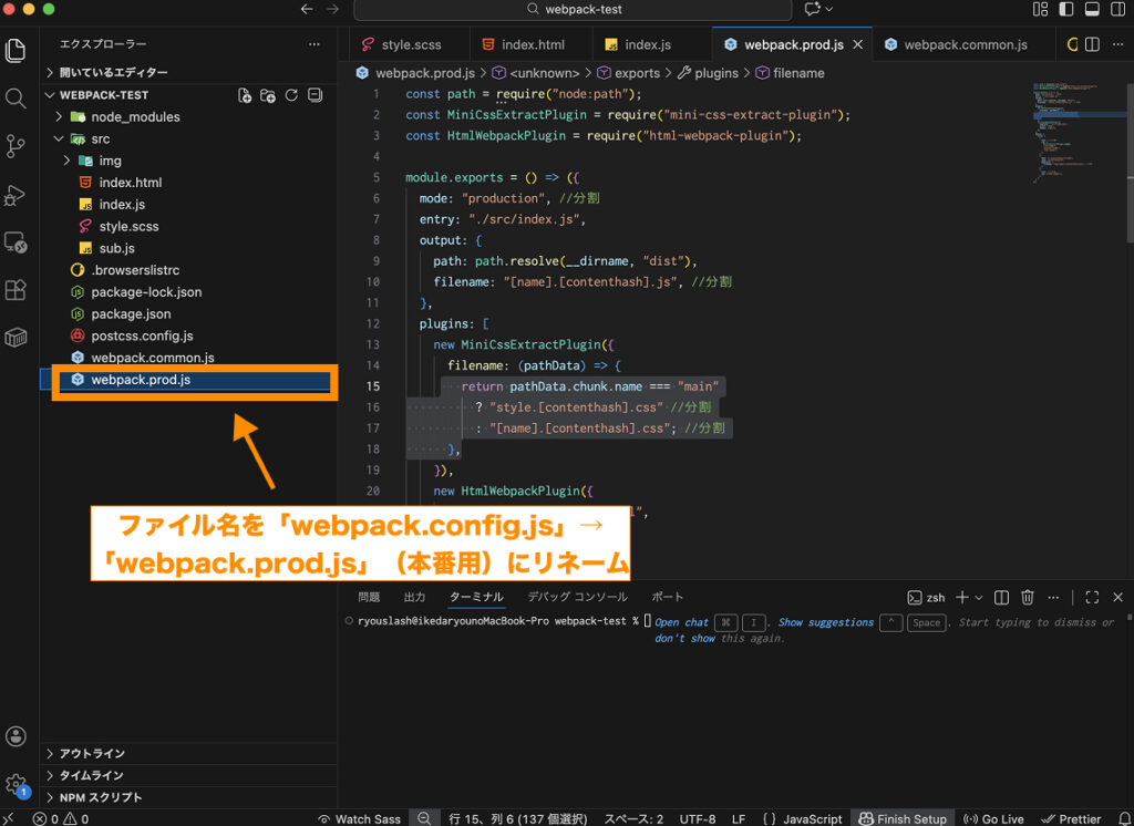 webpack.config.jsに戻り、ファイル名を「webpack.prod.js」(本番用)にリネームします。