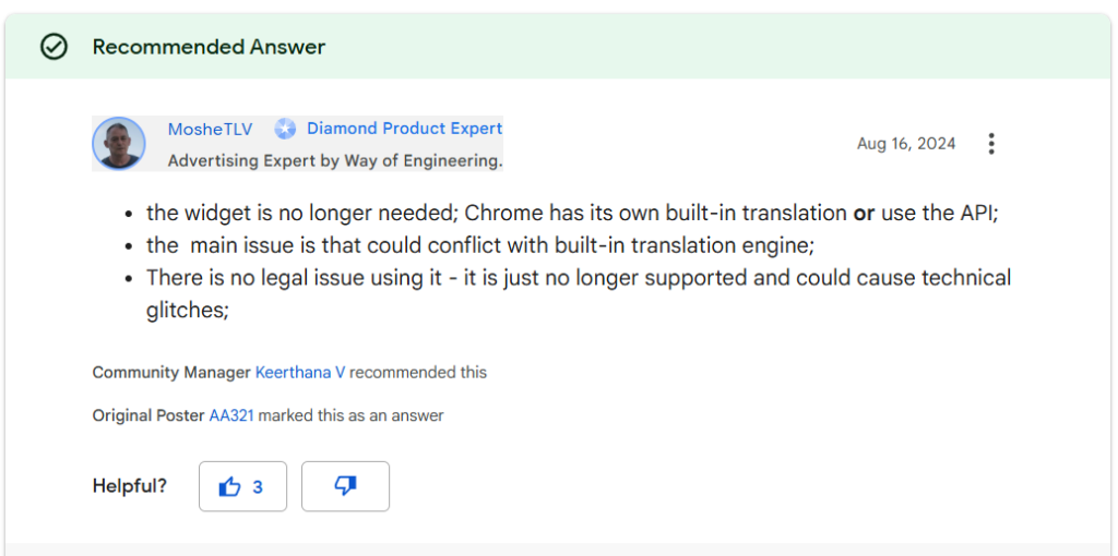 なお、この回答は、Google Translate Communityのコミュニティマネージャーも「Recommended(おすすめ)」としてマークしているようです。